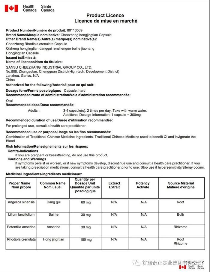 2021年10月19日,甘肃奇正实业集团有限公司向加拿大卫生部提交的奇正红景天当归人参百合胶囊产品正式获得加拿大卫生部批准,获得加拿大健康产品注册号。注册证书如下: