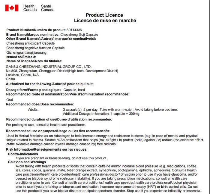 2021年11月20日,甘肃奇正实业集团有限公司向加拿大卫生部提交的奇正天杞胶囊产品正式获得加拿大卫生部批准,获得加拿大天然健康产品注册号。注册证书如下: