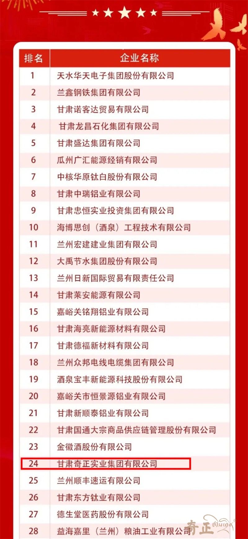 会上,甘肃省工商业联合会发布了“2025年甘肃民营企业100强榜单”。其中,甘肃奇正实业集团有限公司凭借其卓越的经营业绩与深厚的行业影响力强势入围,以29.71亿元的营收总额位列百强榜第24位。