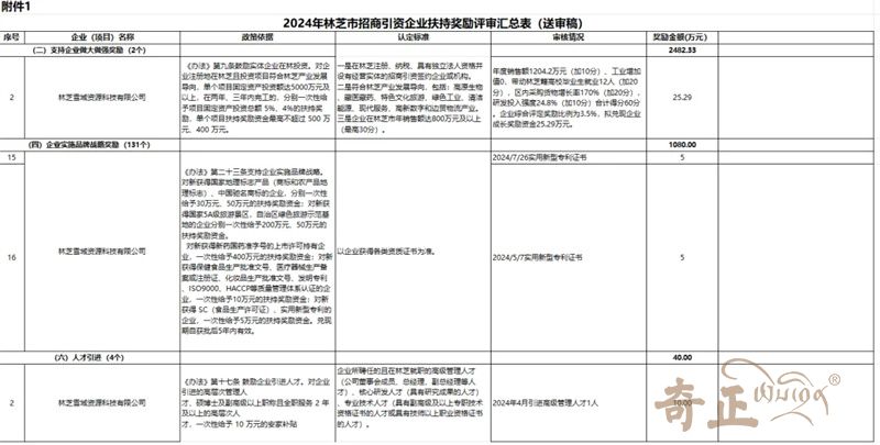 根据《林芝市推进改革开放促进招商引资试行办法》(林政发[2022]69号)相关规定,经林芝市招商引资企业扶持奖励资金评审小组及林芝市发展和改革委员会党组研究同意,林芝雪域资源科技有限公司共获批2024年度招商引资企业扶持奖励资金45.29万元,其中包括:一是根据公司2023-2024年期间销售额、工业增加值、区内采购指数、带动就业以及研发投入强度等情况,给予一定企业成长扶持奖励资金,用于支持研发创新和扩大再生产的企业做大做强奖励25.29万,二是对公司引进的博士学历且全职服务 2 年及以上的高层次人才,一次性给予的安家补贴10万元,三是对公司2023-2024年期间新申报的发明专利给予一次性扶持奖励资金10万元。