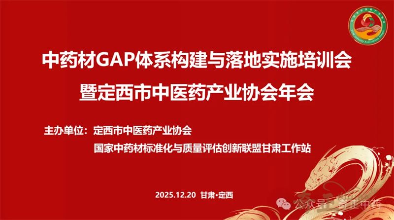 2025年12月20日,“中药材GAP体系构建与落地实施培训会暨定西市中医药产业协会年会”在甘肃省定西市陇西县成功举办。会议由定西市中医药产业协会与国家中药材标准化与质量评估创新联盟甘肃工作站联合主办,陇西奇正药材有限责任公司、甘肃渭水源药业科技有限公司、甘肃陇萃源百草中药材有限责任公司共同协办。来自行业协会、生产企业、种植基地、科研院所以及政府相关部门的百余位代表齐聚一堂,共同探讨新版GAP标准的落地实践与产业高质量发展路径。