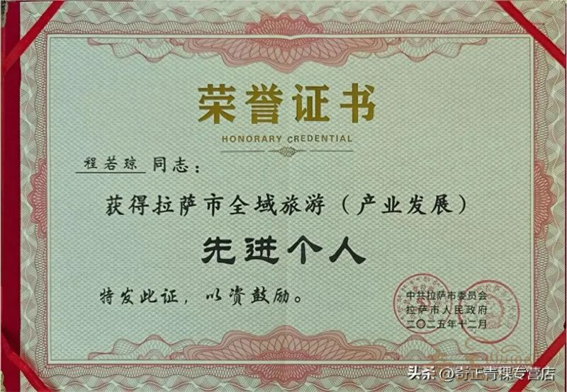近日,奇正集团总经理、西藏奇正青稞健康科技有限公司董事长程若琼因在拉萨市全域旅游(产业发展)领域的实践与成效,荣获拉萨市人民政府授予的 “先进个人”荣誉称号。